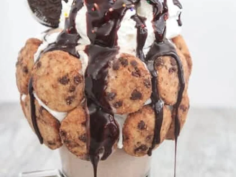 An indulgent milkshake featuring vanilla ice cream blended with creamy peanut butter and crushed chocolate chip cookies, served in glasses rimmed with frosting and mini cookies. The thick, creamy base gets extra texture from coarsely crushed cookies mixed throughout, while chocolate syrup adds rich sweetness. Perfect for special occasions or when you want to turn a simple milkshake into an impressive dessert presentation that will wow kids and adults alike.