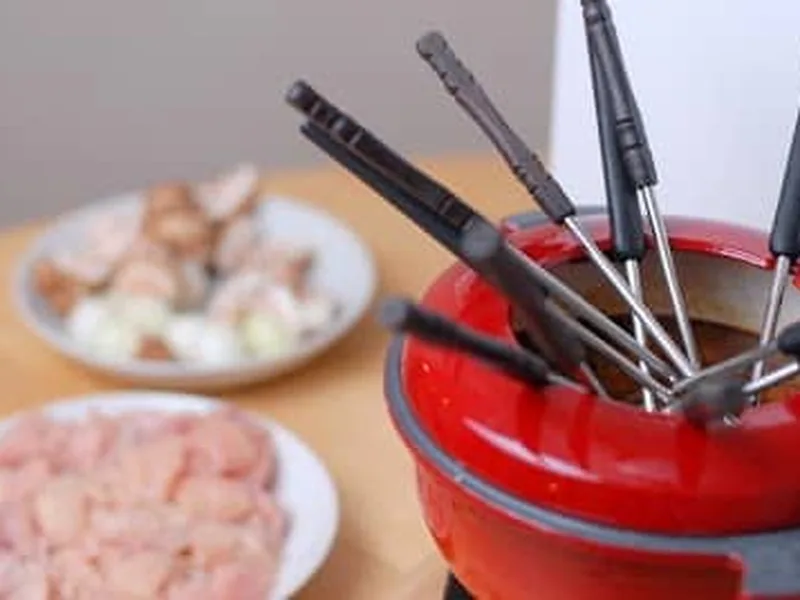 French-inspired fondue featuring chicken breast, pearl onions, and cremini mushrooms cooked in a rich red wine and chicken broth base. Smoked bacon and herbes de Provence add depth to this interactive dinner experience where each guest cooks their own pieces at the table.