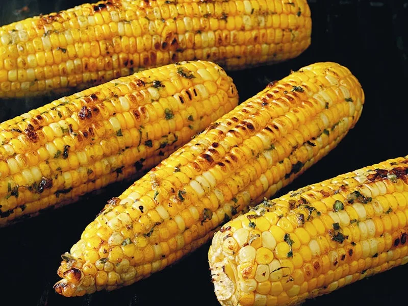 Fresh corn grilled over medium heat until spotted and tender, brushed with a compound butter infused with basil, Parmigiano-Reggiano, garlic, and black pepper. The seasoned butter is mashed together and applied before and after grilling for maximum flavor.