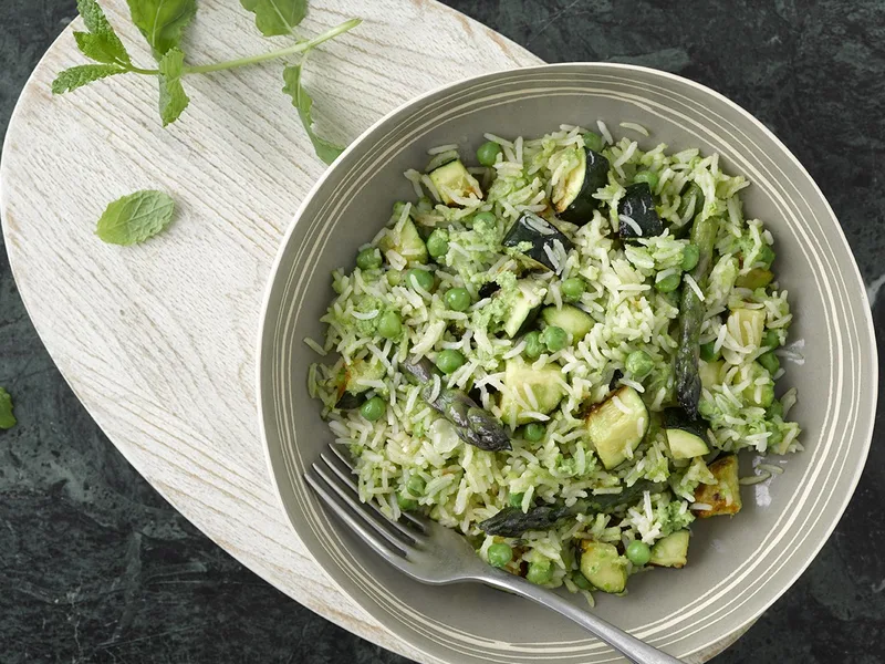 Creamy basmati risotto studded with tender courgette, asparagus, and peas, finished with a vibrant minted pea puree swirled through. Garnished with fresh parsley and melted parmesan for a light, vegetable-forward main course.