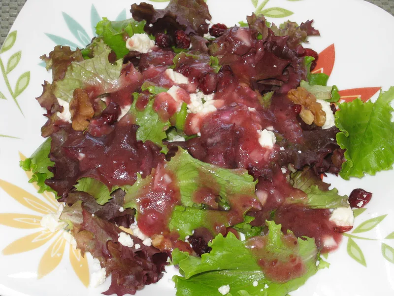 A vibrant baby greens salad anchored by a homemade cranberry balsamic vinaigrette with bright, tart notes balanced by rich goat cheese and crunchy toasted walnuts. The whole berry cranberry sauce adds body and natural sweetness to the classic balsamic base. Ideal for lunch, light dinners, or as a elegant side for holiday meals and special occasions. This version combines both fresh and dried cranberries for layered fruit flavor and texture contrast.