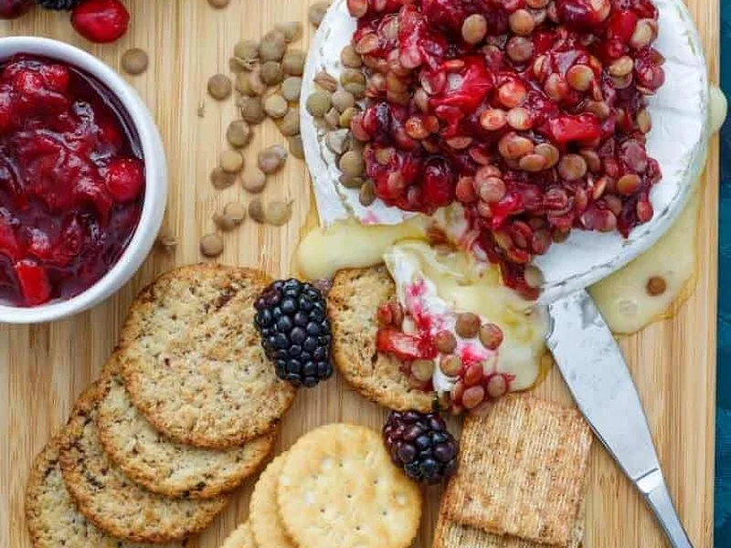 Cook lentils and prepare cranberry sauce up to 3 days in advance. Bake the cheese and assemble just before serving to preserve creamy texture. Reheat the cheese for 5 minutes at 350F if made more than 15 minutes ahead.
