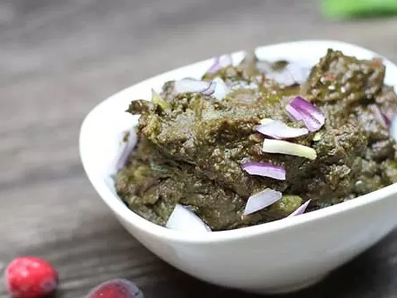 South Indian-style chutney combining tart cranberries with wilted spinach, tempered with mustard seeds, urad dal, and chana dal. Roasted spices and garlic are ground into a smooth, tangy condiment. Serve as an accompaniment to dosas, idlis, or rice.