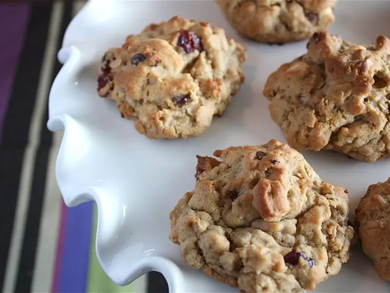 Chewy oatmeal cookies studded with tart dried cranberries, creamy white chocolate chips, and crunchy walnuts. The brown sugar base creates a soft, dense crumb that stays moist for days, while the fruit and chocolate provide bright, sweet contrast. The rolled oats add wholesome texture and nuttiness. These are ideal for everyday baking, lunch boxes, and casual gatherings. Perfect with coffee or tea, they're substantial enough as a snack but won't overwhelm. This version balances tartness with richness—the cranberries cut through white chocolate's sweetness, and the walnuts prevent the cookies from feeling one-note. The high brown sugar ratio produces cookies with deep caramel notes and chewy centers, setting them apart from thin, crispy oatmeal varieties.