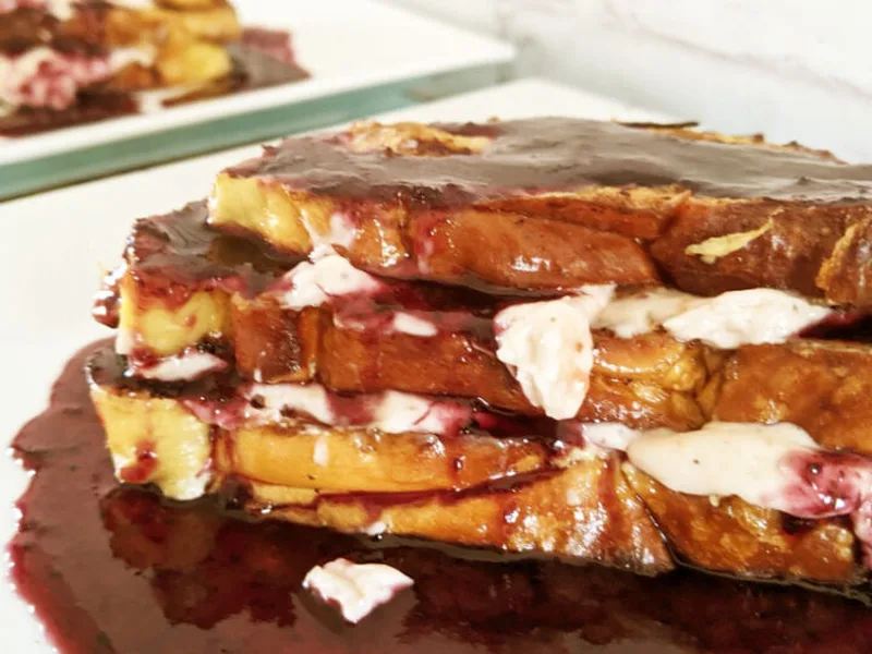 Triple-decker French toast layered with a creamy blend of room-temperature cream cheese and fruit jam. Thick-cut challah or sourdough bread is dipped in an egg custard enriched with brown sugar and vanilla, then pan-fried until golden and kept warm in the oven. Assembled into three-slice stacks with jam-cream cheese filling between each layer.