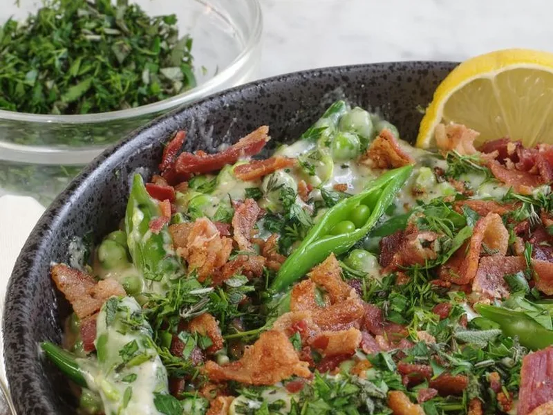 Creamy Bacon Sugar Snap Peas with Nutmeg