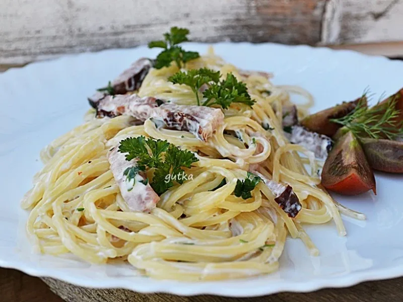 A simplified take on the Italian classic, this carbonara combines spaghetti with crispy bacon, creamy sauce, and melted processed cheese for comfort food appeal. The dish centers on the interplay between al-dente pasta and a rich, smooth sauce built from bacon fat, cream, and cheese. What sets this version apart is the use of processed cheese and cream instead of traditional eggs and Pecorino Romano, making it more forgiving for home cooks while delivering indulgent, velvety results. Fresh parsley adds brightness to balance the richness. This recipe suits weeknight dinners when you want restaurant-quality flavor without complexity. Serve hot immediately after tossing, and the creamy sauce coats each strand beautifully. Perfect for casual suppers or when feeding guests who appreciate bold, straightforward flavors without fussy techniques.