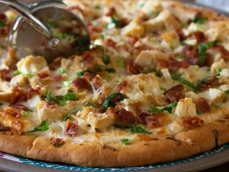 Classic pizza featuring rich Alfredo sauce, mozzarella, grilled chicken, and Parmesan cheese on a crispy crust. Finished with fresh parsley and olive oil drizzle for a restaurant-quality dish ready in under 30 minutes.