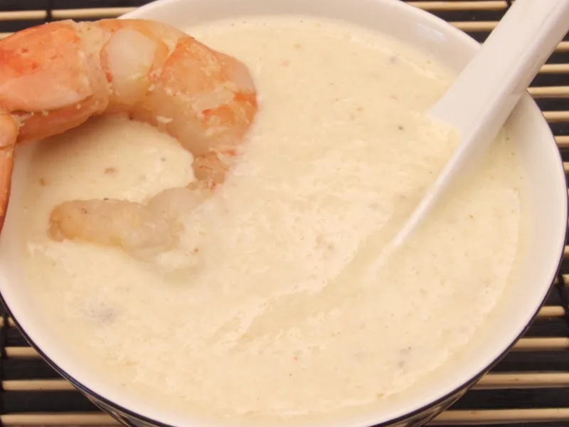 A refined seafood bisque made with a butter-flour roux base, fish stock, and cooked white fish, enriched with pounded prawns that create a silky texture. White pepper and garlic provide subtle seasoning. Cream finishes the soup, which is blended smooth then garnished with whole reserved prawns. Serve as an elegant starter or light main course for special dinners or when showcasing quality seafood. This version combines both whole and processed prawns for textural contrast and depth.