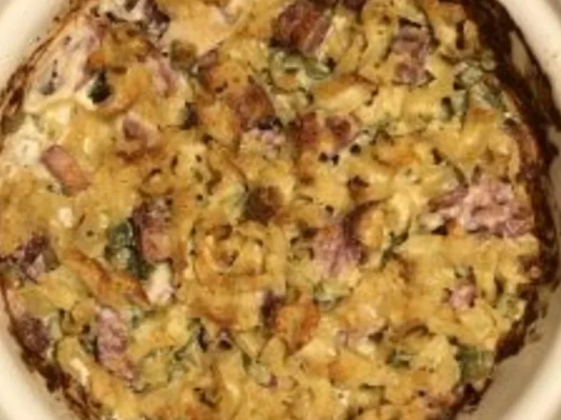 Egg noodles tossed with a smooth cream cheese sauce studded with ham, bell pepper, and celery. Baked until the top crisps, this comfort casserole delivers tender pasta in a rich, savory sauce with garlic and parmesan cheese throughout.