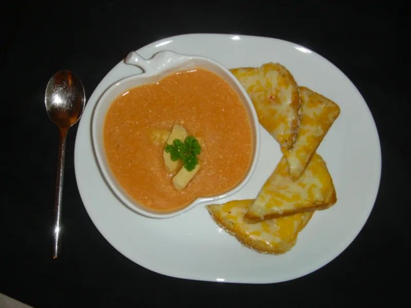 A smooth, plant-based tomato soup thickened with blended tofu instead of cream. Fresh tomatoes simmer with aromatics and vegetable stock, then the mixture is strained to remove skins and seeds before tofu is blended in for a velvety texture. Finished with a touch of olive oil and warming spices.
