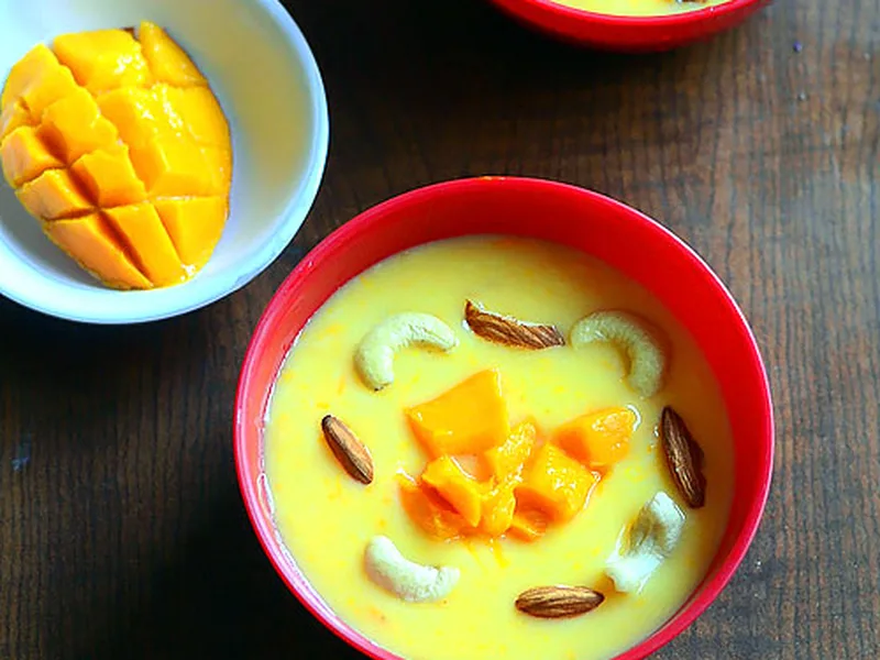 A silky-smooth mango custard dessert that combines the richness of full-fat milk with bright, tropical mango flavor. This chilled fruit custard features a delicate vanilla custard base infused with mango pulp, creating a naturally sweet, creamy texture that's neither too heavy nor overly rich. The dish balances warmth from vanilla with cool, fruity mango notes, finished with fresh mango chunks and crunchy nuts for textural contrast. Perfect for home cooks seeking an elegant yet simple dessert that feels special without demanding advanced technique. Serve it after dinner during warm months, at summer gatherings, or whenever you want something refreshing and indulgent. What sets this version apart is the dual use of mango—both as a smooth puree for flavor and as fresh chunks for texture—giving it complexity beyond standard custards while remaining accessible and quick to prepare.