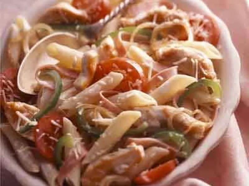 A hearty pasta dish combining tender chicken strips and smoky ham in a rich cream sauce with fresh vegetables. The colorful mix of green peppers, onions, and Roma tomatoes creates an appealing contrast against the creamy penne base. Perfect for weeknight dinners when you want something satisfying yet quick to prepare. The addition of both chicken and ham makes this particularly filling, while fresh Parmesan adds a sharp finish to balance the cream.