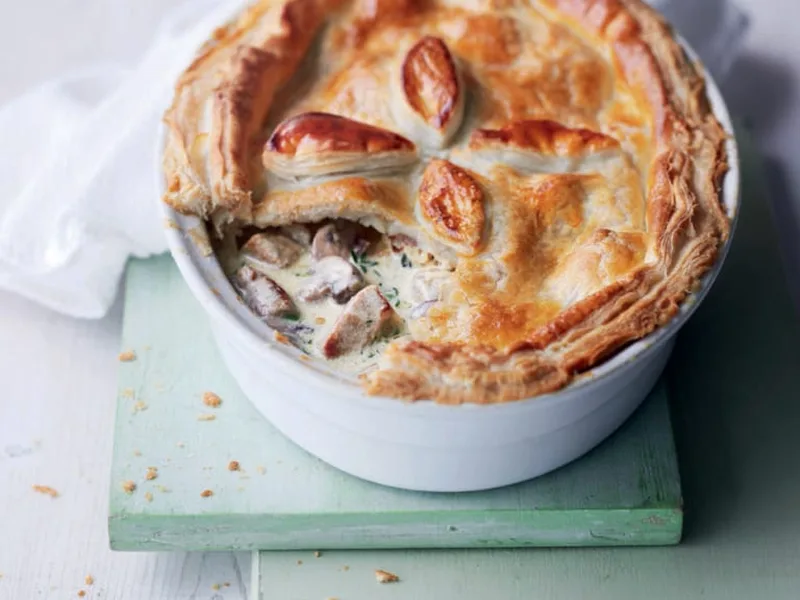 A rich, comforting one-dish meal featuring tender cubed pork loin and earthy chestnut mushrooms bound in a silky cream sauce infused with fresh thyme and bright lemon zest. The filling sits beneath a golden, crispy puff pastry crust that becomes wonderfully flaky in the oven. This is an impressive yet straightforward dinner for anyone seeking elegant comfort food without extensive technique. The combination of savory pork, umami-rich mushrooms, and bright citrus creates depth and balance, while the double cream and stock create a luxurious sauce. Perfect for weeknight dinners that feel special, or when entertaining friends and family. What sets this version apart is its simplicity—one ovenproof dish, minimal fussing, and the magic of good ingredients coming together. The ready-rolled pastry makes it accessible, while fresh thyme and lemon zest enhance it beyond basic. Serve alongside creamy mashed potatoes and sharp greens to cut the richness.