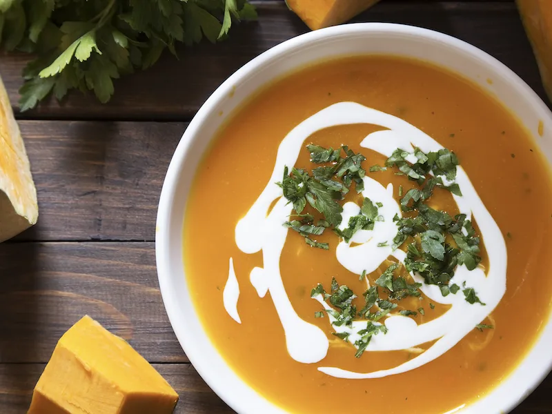 Creamy Pumpkin Bisque with Chipotle and Pecan Crunch
