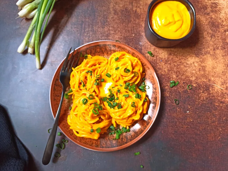 A fully plant-based take on creamy pumpkin pasta that delivers rich, velvety sauce without dairy. Roasted Hokkaido pumpkin, bell peppers, and tomato form the base, caramelized in the oven until deeply flavorful, then blended into a naturally sweet and savory sauce. Smoked paprika adds subtle depth while fresh garlic infuses warmth throughout. The result is silky and satisfying, perfect for anyone seeking comfort food that aligns with vegan values. Serve this to impress vegetarian guests or anyone craving seasonal, vegetable-forward pasta. What sets this version apart is the no-cream approach relying on pumpkin's natural starch and plant-based creme fraiche, keeping the dish light yet luxurious. Finishing touches of fresh herbs or vegan feta add brightness and textural contrast. Ideal for autumn dinners when pumpkins peak, though adaptable year-round.