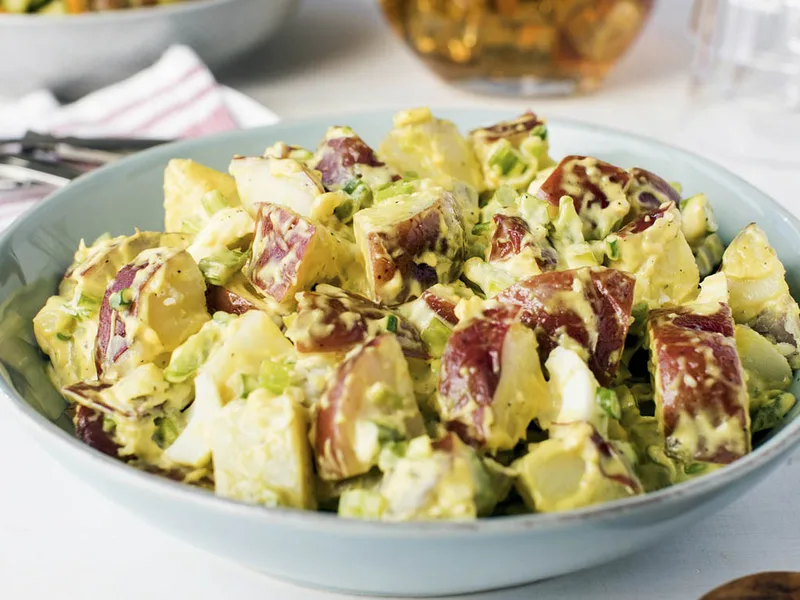 A classic American potato salad combining tender red potatoes with a tangy mayonnaise dressing enriched by yellow mustard. Creamy, slightly sweet, and studded with celery, green onions, and hard-cooked eggs, this side dish works for picnics, barbecues, potlucks, and casual family dinners. The mustard provides distinctive tang that balances the richness of the mayo, while the combination of textures from soft potatoes and crisp vegetables makes each bite interesting. Best served chilled and ideal for feeding a crowd.