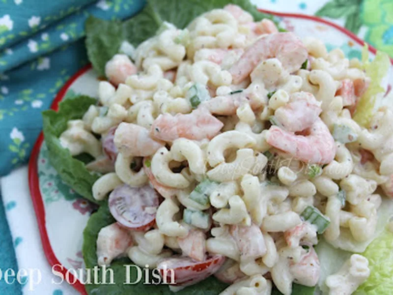 A chilled seafood pasta salad combining tender shrimp, elbow macaroni, and fresh vegetables in a tangy Creole-mustard mayonnaise dressing. The addition of pickle juice and Old Bay seasoning gives it a distinctive briny, coastal flavor. Perfect for summer gatherings, potlucks, or light dinners. This version balances richness from mayo and sour cream with bright acidity from lemon juice and pickle brine, set apart by its Cajun-Creole spice profile.
