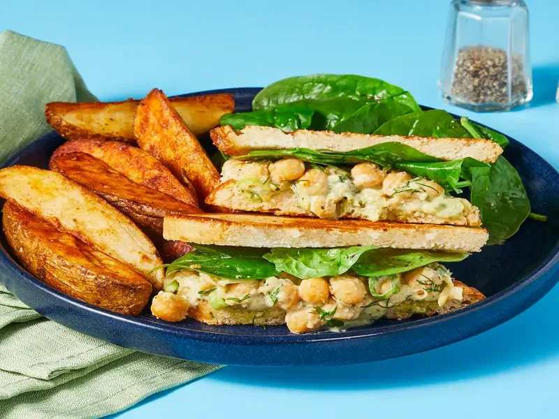 A hearty sandwich featuring creamy mashed chickpeas mixed with fresh herbs and tangy pesto mayo, crispy bacon strips, and lemony spinach on golden toasted sourdough. The roasted potato wedges seasoned with fry seasoning make a perfect crispy side. This satisfying meal combines protein-rich chickpeas with smoky bacon for a filling lunch or dinner that brings together fresh flavors and comforting textures.