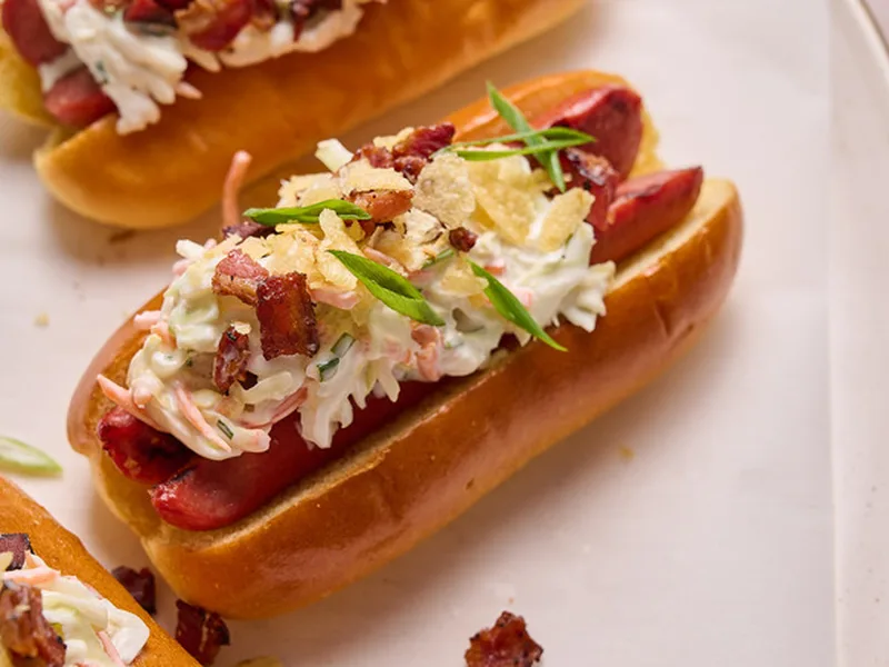 Grilled beef hot dogs butterflied and charred, topped with tangy creamy slaw made from shredded green cabbage and carrots, crispy applewood bacon, crunchy potato chips, and fresh scallions. Perfect for casual outdoor entertaining or weeknight dinners. The potato chip topping adds unexpected crunch while the cool slaw balances the smoky grilled meat, making this a fun twist on the classic hot dog.