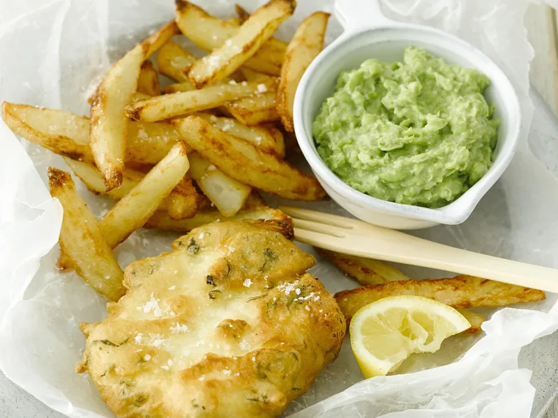 Prepare chips through the boiling step up to 4 hours ahead. Prepare batter no more than 30 minutes before frying. Make mushy peas up to 1 day ahead and reheat gently. Fry tofu only just before serving.