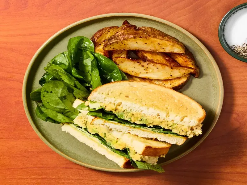 Hearty sandwiches combining tender seared chicken cutlets and creamy mashed chickpea salad on golden toasted sourdough. The chickpeas are partially mashed with fresh dill, scallions, and a tangy miso-mayo dressing, creating satisfying texture contrasts. Served alongside crispy roasted potato wedges seasoned with fry seasoning and fresh lemony spinach. This protein-packed meal works perfectly for lunch or dinner when you want something filling yet fresh.