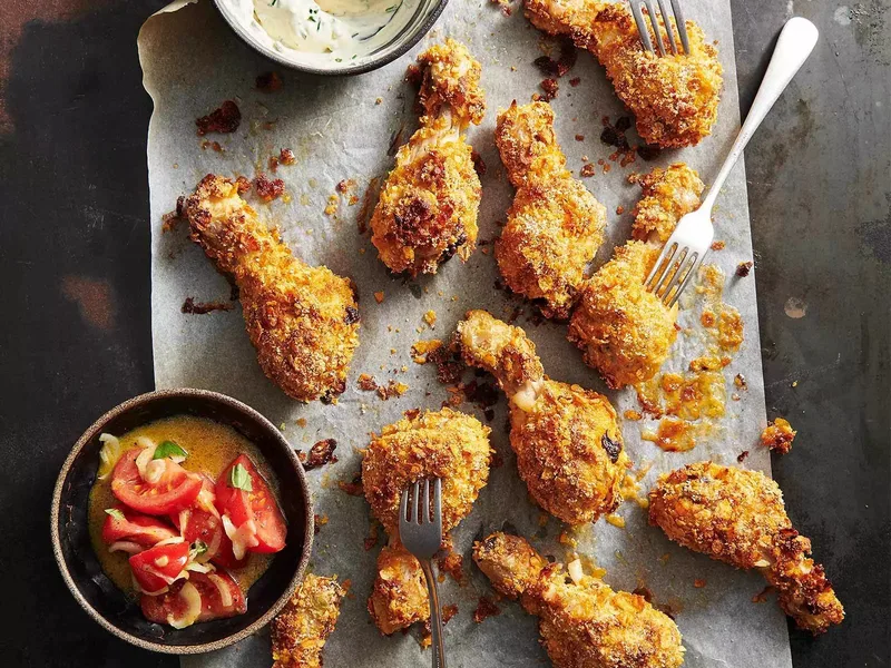 Oven-baked chicken drumsticks coated in a crunchy cornflake and breadcrumb crust. Skin is removed before breading and the pieces are baked until golden. Served with a creamy herb dip made from creme fraiche, mayonnaise, and fresh chives seasoned with mustard and cayenne.