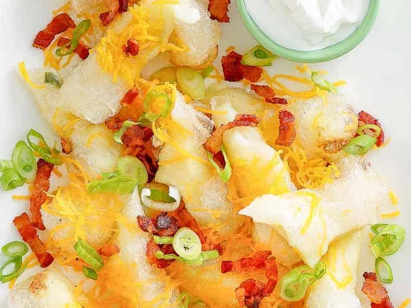 Serve immediately while hot and crispy with sour cream for dipping. Garnish with extra cheese, bacon, and green onions.