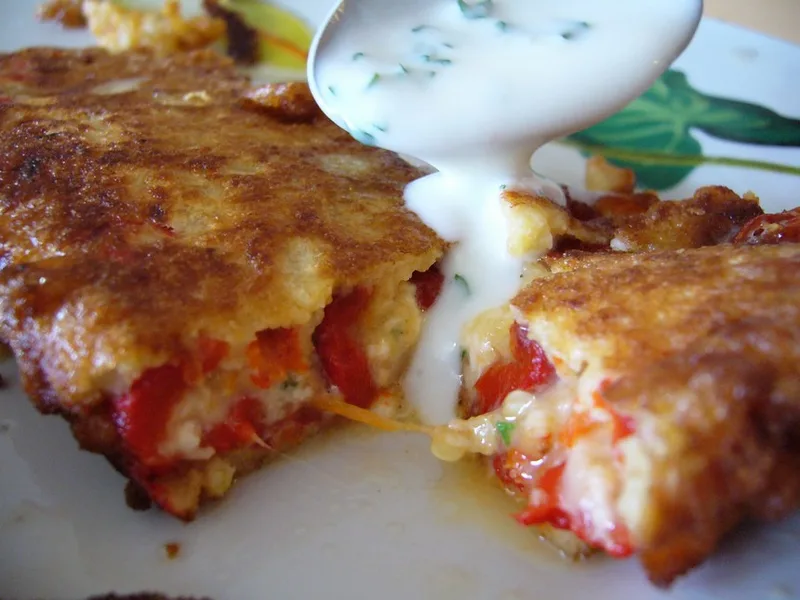 Roasted bell peppers stuffed with crumbly feta and yellow cheese, then triple-coated in egg and breadcrumbs for a golden crispy exterior. This traditional Bulgarian chushki burek balances savory cheese filling with fresh herbs and a cooling yogurt-garlic sauce. Serve hot as an appetizer, side dish, or light main course. The combination of roasted pepper sweetness and fried cheese richness with bright dill yogurt creates an authentic Balkan flavor profile that works for family dinners, entertaining, or mezze spreads.