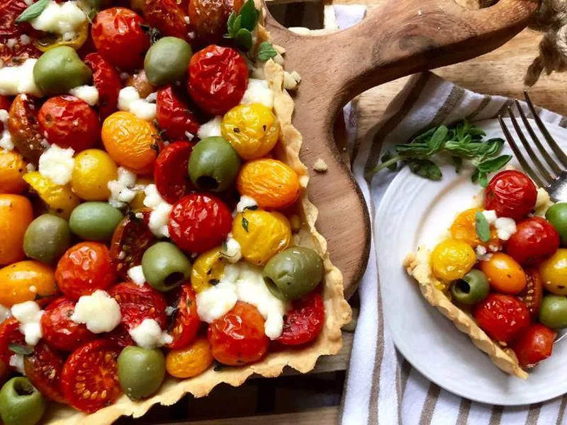 A savory French-style tart featuring a buttery, crisp pastry crust topped with roasted cherry tomatoes, briny green olives, crumbly queso fresco, and fresh oregano. The pine nuts baked into the crust add textural contrast and subtle nuttiness. Ideal for summer entertaining, light lunches, or vegetarian dinner parties. This version distinguishes itself through a two-stage bake that ensures the pastry remains crispy despite the tomato topping, and the careful placement of delicate cheese and olives only in the final minutes prevents overcooking.