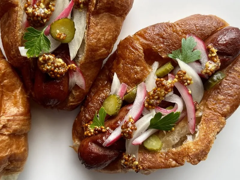 the humble hot dog with buttery croissants, scored and pan-seared until golden. Tangy pickled red and white onions, whole grain mustard, and briny cornichons create a sophisticated French-inspired sandwich. The key is scoring the hot dogs to maximize caramelization and warming the croissants in the residual pan heat for textural contrast. Serve as an elegant lunch, casual dinner, or impressive appetizer that feels more refined than its simple ingredient list suggests.