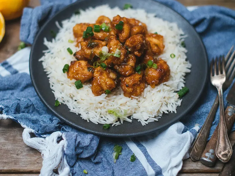 Golden-fried chicken coated in a tangy orange-brown sugar glaze with fresh ginger, garlic, and sesame. The tempura batter creates a crispy exterior while the sauce thickens with cornstarch, clinging to each piece. Finished with sesame seeds and green onions for brightness and crunch. Serve over rice.