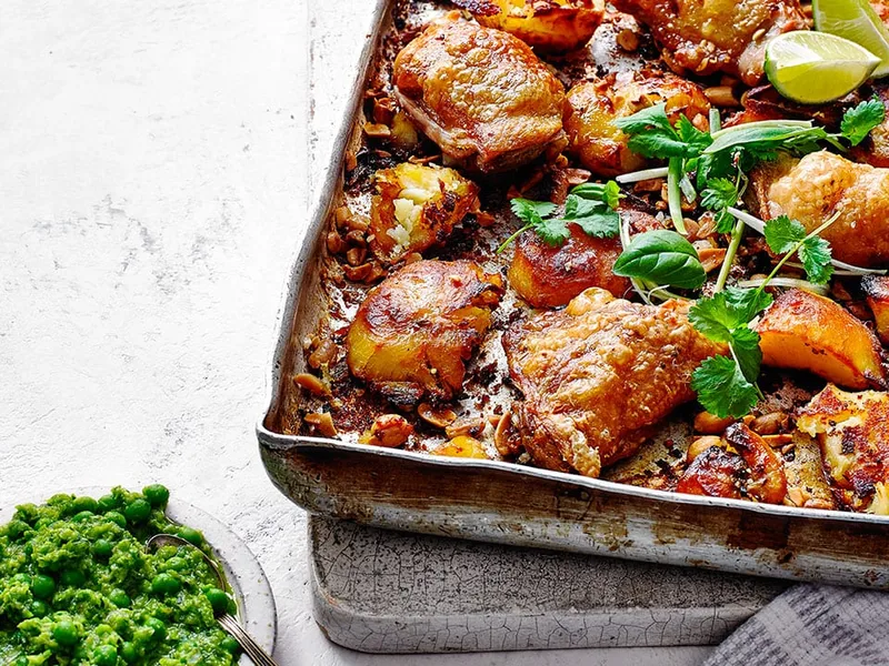 A one-pan roast that combines tender chicken thighs with crunchy peanut-crusted potatoes and a vibrant, herbaceous pea sauce. The dish balances rich, salty peanuts against bright lime and fresh coriander and basil, creating layers of flavor and texture in every bite. Roasting the potatoes at high heat creates golden, crispy edges while the chicken skin crisps alongside. The blended pea sauce—half smooth, half chunky—adds freshness and mild pepper sweetness. This is weeknight cooking that feels special, suited for anyone wanting restaurant-quality results without fuss. Serve it warm from the pan for casual family dinner or a relaxed gathering. What sets this apart is the two-stage oven technique that ensures both potatoes and chicken cook perfectly, plus the uncooked herb finish that brightens everything on the plate.