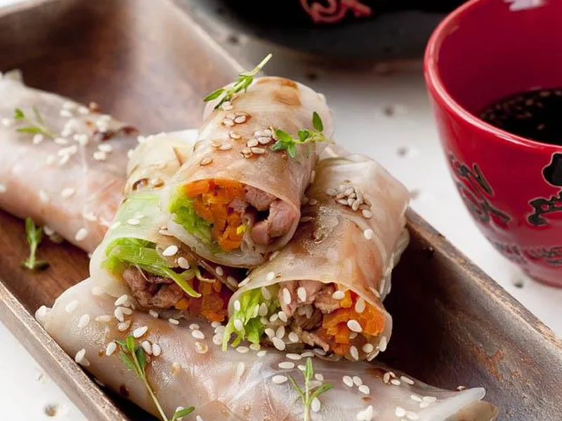 Rice phyllo wraps are a delicate, gluten-free alternative to traditional spring rolls, built around tender steak and fresh julienned vegetables. What sets this version apart is the simplicity of technique combined with the textural contrast between the crispy-when-fried rice paper exterior and the soft, savory filling. The steak provides rich umami depth, while individually sauteed carrots, leeks, and zucchini add sweetness and earthiness without oversaturating the filling with moisture. The wraps brighten when dipped in soy sauce and scattered with toasted sesame seeds, adding nutty notes. This dish suits weeknight dinners for home cooks seeking restaurant-quality results without complexity, or meal-prep enthusiasts wanting protein-forward rolls. Serve warm as an appetizer, light lunch, or part of an Asian-inspired dinner spread. The technique honors minimal, clean flavors while celebrating the beef.
