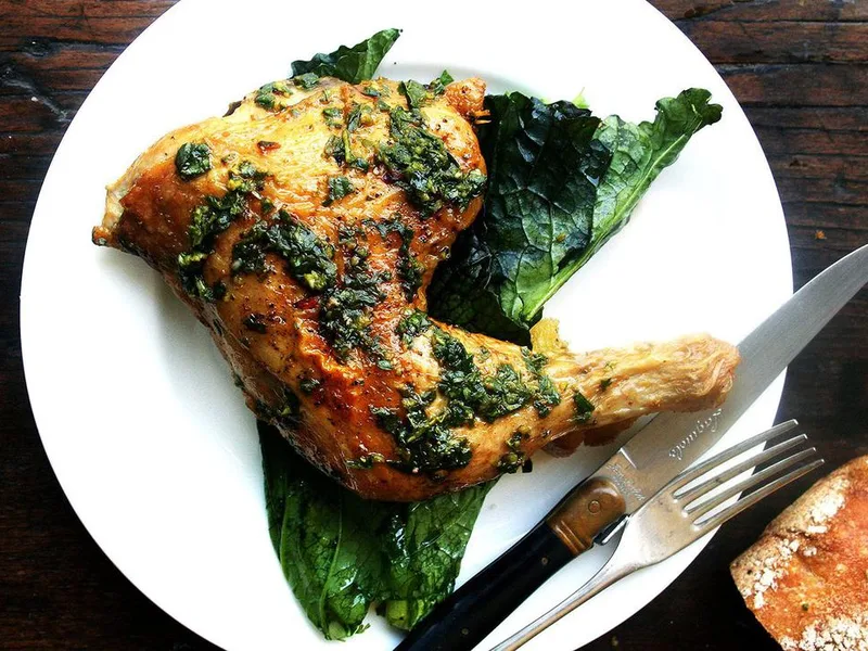 Quartered chicken roasted skin-side up until golden and crispy, then finished with a bright basil-garlic sauce made from pan drippings. The vinegar cuts through the richness while fresh basil and red pepper add herbaceous heat. Serve for weeknight dinners or casual entertaining. This version prioritizes texture contrast, keeping the sauce separate until the last moment to preserve the crackling skin.