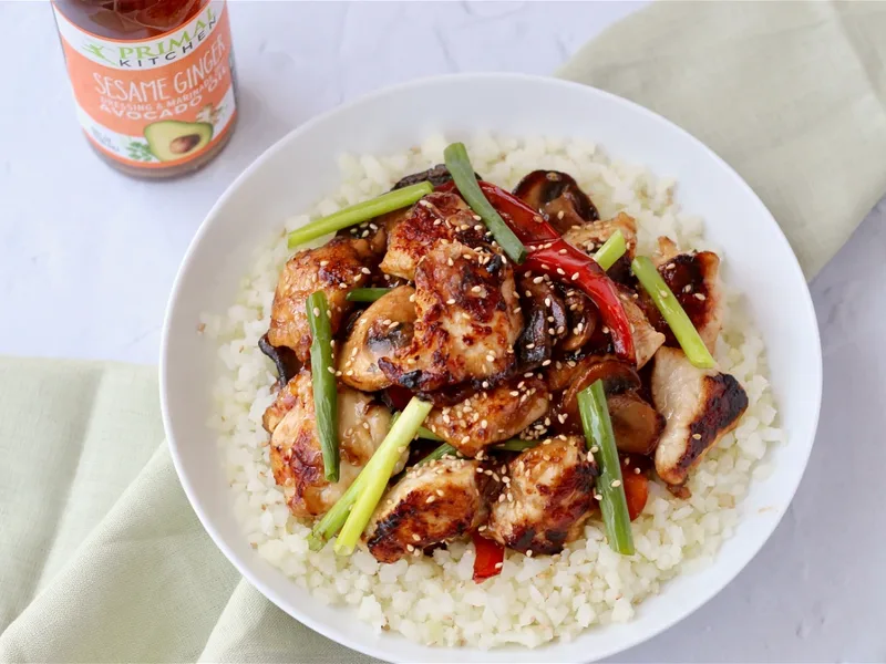 Marinate chicken up to 4 hours ahead. Prep mushrooms, peppers, and green onions; store separately. Cook cauliflower rice fresh or reheat gently.