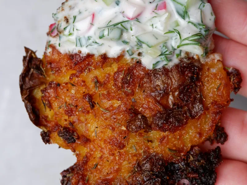 Waxy potatoes flattened on a baking sheet, brushed with seasoned oil, and roasted until golden and crispy. Served alongside a fresh dip made from vegan sour cream, mayo, lemon, and finely diced vegetables including radish, celery, and cucumber.