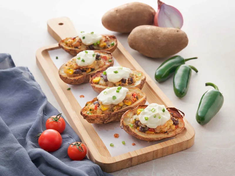Loaded potato skins deliver bold Tex-Mex flavors in a shareable appetizer or light meal. Crispy potato shells meet a savory filling of seasoned black beans, corn, jalapeños, and cumin-spiced vegetables, then crowned with melted cheddar and cool sour cream. The contrast of textures—crunchy skin against tender, creamy filling—makes this dish crave-worthy. Key flavors include earthy cumin, bright jalapeño heat, and tangy sour cream that cools the spice. Fresh spring onion adds final pep. Perfect for casual entertaining, game days, or a meatless dinner that feels indulgent without heavy calories. This version balances fat-free sour cream with full-flavored cheese and beans, keeping it lighter than pub versions while maintaining rich, complex taste. Microwaving potatoes before broiling saves time without sacrificing crispy exteriors.
