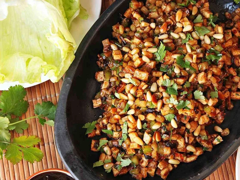 San choi bao reimagined with plant-based protein, these Cantonese-style lettuce cups deliver crispy pan-fried tofu, toasted pine nuts, and fresh jicama in a savory-sweet hoisin sauce. The magic lies in the contrast: tender iceberg or leaf lettuce wraps filled with layers of texture—nutty pine nuts, chewy mushrooms, bright diced vegetables, and umami-rich tofu that browns until golden. Key flavors balance salty soy and hoisin against vinegar's tang and optional chili heat, while ginger and garlic perfume every bite. This version celebrates the vegetable-forward spirit of traditional san choi bao while enhancing humble tofu through proper pressing and high-heat browning. Perfect for casual entertaining, light weeknight dinners, or meal prep—serve as a hands-on appetizer or main course. The jicama adds crisp sweetness absent from classic recipes, while pine nuts replace ground pork, creating a sophisticated vegetarian take that carnivores and plant-eaters alike will enjoy.