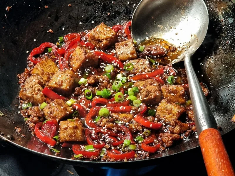A vibrant wok-cooked tofu stir fry that combines crispy-edged tofu cubes with fresh peppers, spring onions, ginger, and garlic in a balanced sesame-soy glaze. The dish showcases the interplay of umami-rich soy sauce, nutty sesame oil, and bright lime juice against the gentle heat of chili. Corn starch coating gives the tofu a golden exterior while keeping the interior tender. Perfect for vegetarians and anyone seeking a quick, restaurant-quality weeknight dinner that's ready in 20 minutes. Serve over steamed rice for a complete meal. This version prioritizes textural contrast and bold Southeast Asian flavors, enhancing simple ingredients through proper wok technique and a carefully balanced sauce.