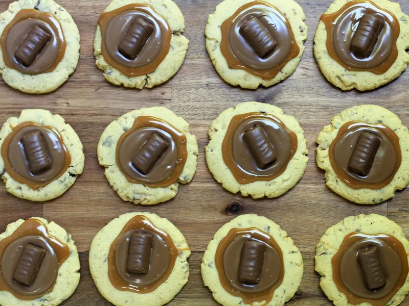 Spoon chocolate over caramel on each cookie and spread to cover. Immediately place one fun-sized chocolate bar in the center of each cookie.