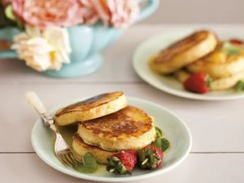 Fluffy ricotta pancakes made with separated eggs and folded egg whites, cooked in a crumpet form for uniform rounds. Topped with warm honey butter, fresh strawberries, and mint. The ricotta adds tenderness while the honey butter provides sweet richness.