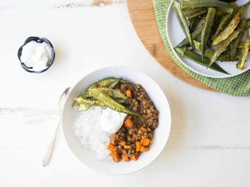 A warming Indian-inspired meal featuring creamy spiced lentils simmered with aromatic vegetables, served alongside fluffy basmati rice and crispy roasted okra seasoned with cumin and curry powder. The combination of garam masala, fresh ginger, and tomato paste creates a rich, complex sauce that coats the lentils beautifully. Perfect for weeknight dinners or meal prep, this satisfying vegetarian dish offers plenty of protein and fiber. The roasted okra adds a delightful textural contrast, while fresh lime and cooling yogurt brighten each bite. This version stands out for its simple technique that builds layers of flavor without requiring extensive prep time.