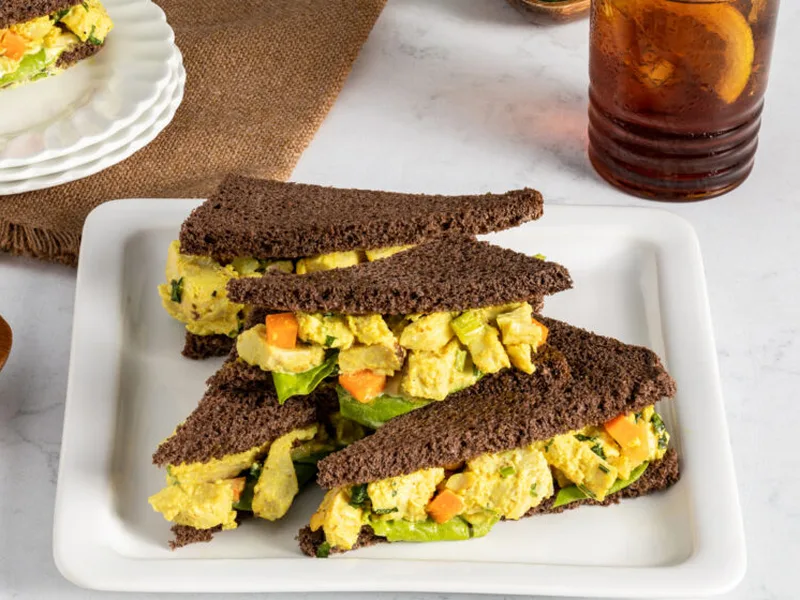 Fragrant curry-spiced chicken salad with roasted cashews, fresh cilantro, and crisp vegetables bound in creamy mayo, chilled and served on bread with bib lettuce. Perfect for elegant tea service or light lunch. Flavors develop during refrigeration for optimal taste.