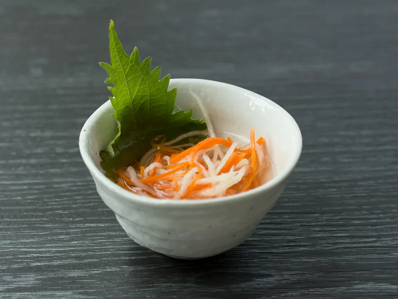 Crisp Japanese pickle combining julienned daikon and carrot, salted to release water then dressed with rice vinegar, mirin, and sugar. The vegetables are squeezed dry before marinating to prevent dilution. Bright, tangy, and refreshing, it pairs well with rice bowls and grilled proteins.
