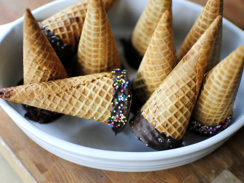 Crispy sugar cones filled and coated with melted dark chocolate using a double boiler method, then topped with sprinkles or sea salt before chilling. The chocolate hardens to a thin shell that cracks satisfyingly when bitten into cold ice cream.