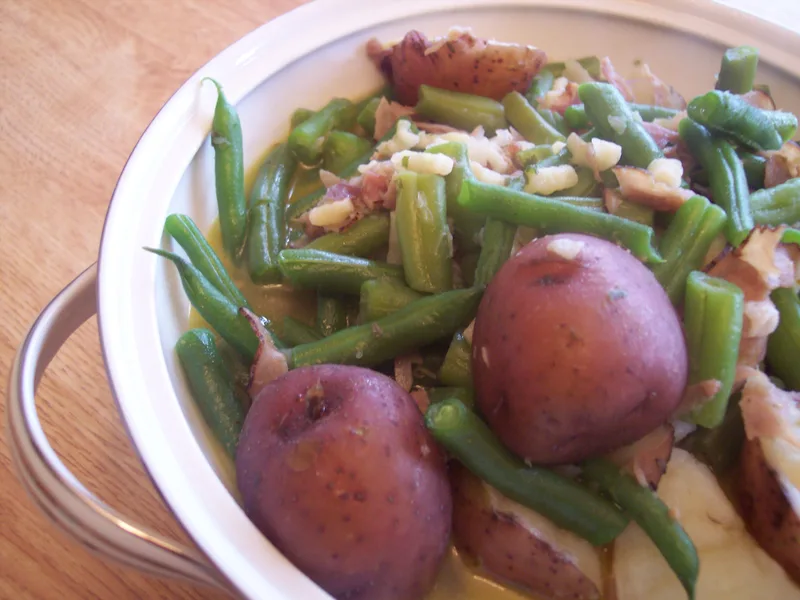 All-day crockpot dish combining fresh green beans, bacon, and red potatoes in a savory broth. Ingredients layer into the slow cooker with chicken bouillon and cook until tender, making an easy one-pot meal that requires minimal hands-on time.