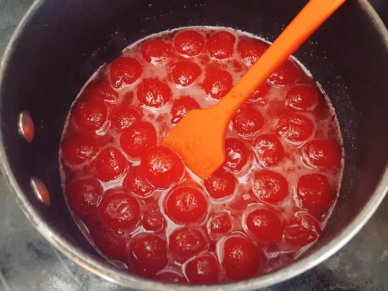 Do not cool cherries in the pot to avoid over-absorption of syrup and mushy texture.