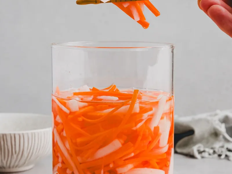 Quick Vietnamese pickle of carrot and daikon matchsticks brined in white balsamic vinegar and sugar. Salt-massaged vegetables soften slightly while developing bright, tangy flavor. Ready in 2 hours but best after 12 hours refrigeration. Serve as a condiment with banh mi, rice bowls, or grilled meats.