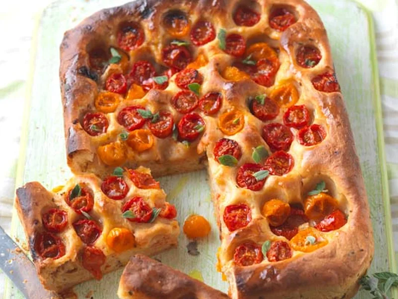 Rustic Italian focaccia combining bread mix, sun-dried tomatoes, and fresh baby plum tomatoes pressed into dimples. Aromatic oregano infuses the soft dough, which rises for 30-40 minutes before baking until golden and crusty. Simple, impressive, and ready in under two hours.